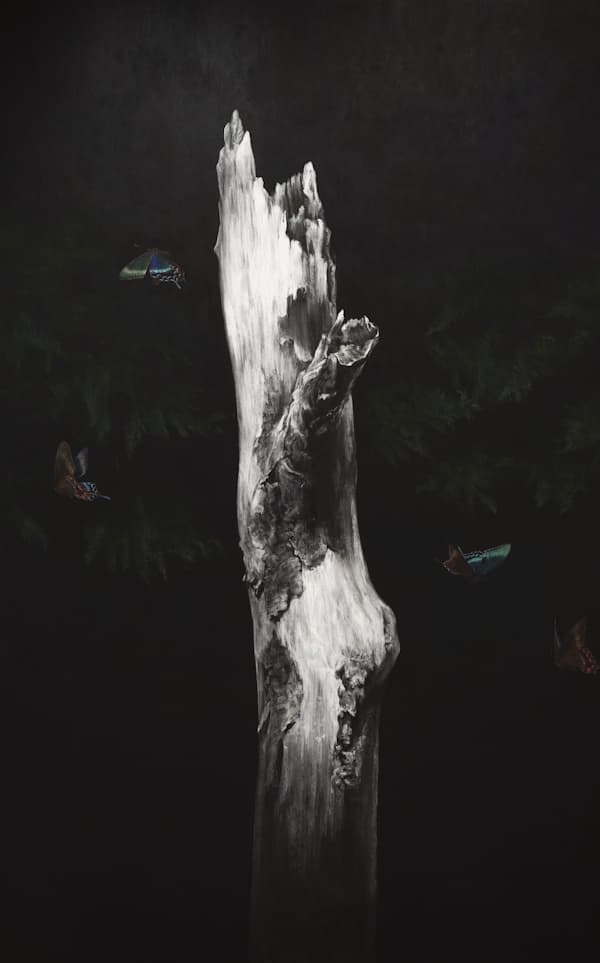 その生命力を魂の象徴として日本画材を用いて表現している。この世に生まれたすべての生命は、世界を形作る欠かせない要素であり、それぞれが生きることにより他の生命に影響を与え、その連鎖は未来へと受け継がれていく。枯木は過去の時間の蓄積や歴史を、その周りを飛ぶ蝶は今を生きる命(魂)を象徴しており、生命が互いに影響し合うこの瞬間の世界の様子を表現している。