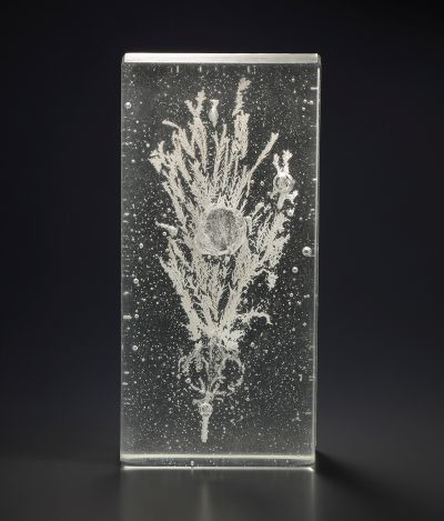 佐々木類「植物の記憶 / 忘れじの庭 −雪降る白山麓からの贈り物−」 2022年 ガラス、植物 32×15×4.5cm 撮影:来田猛