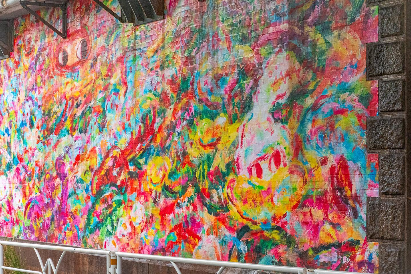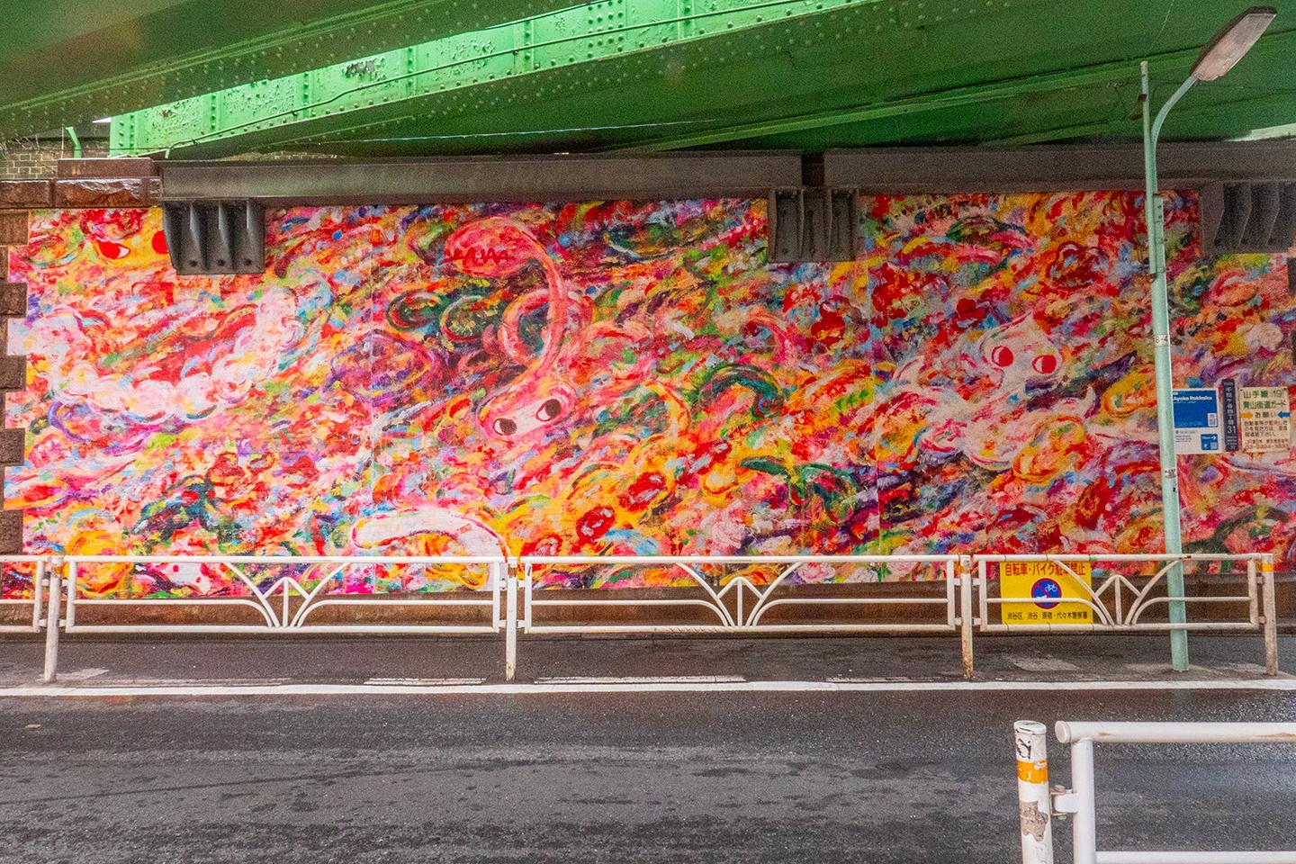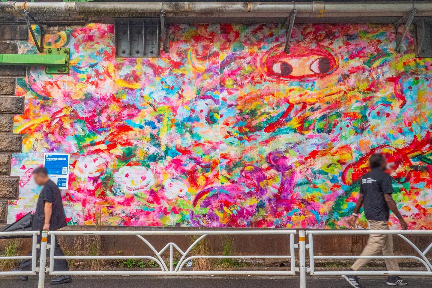 今回訪れたのは代々木駅前の高架下にあるロッカクアヤコの巨大壁画である。今年3月に公開され間もないこともあり、鮮やかな色彩と人気作家ロッカクアヤコの作品であることに通りがかる人が歓声を上げるほど。そんな一瞬で心を掴まれるような作品を立ち止まってじっくり見て本質に迫る。