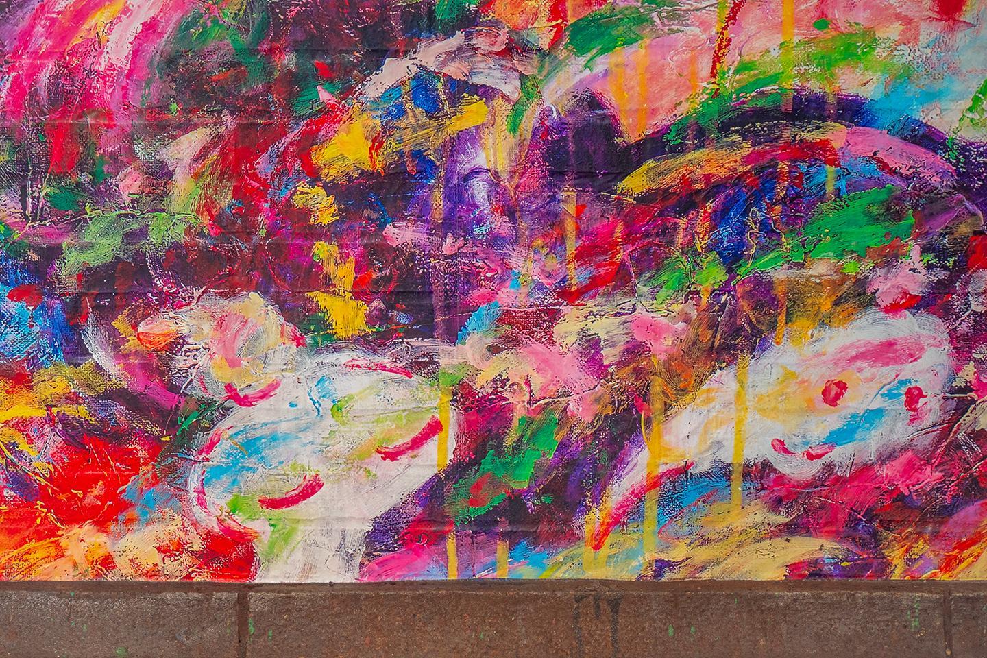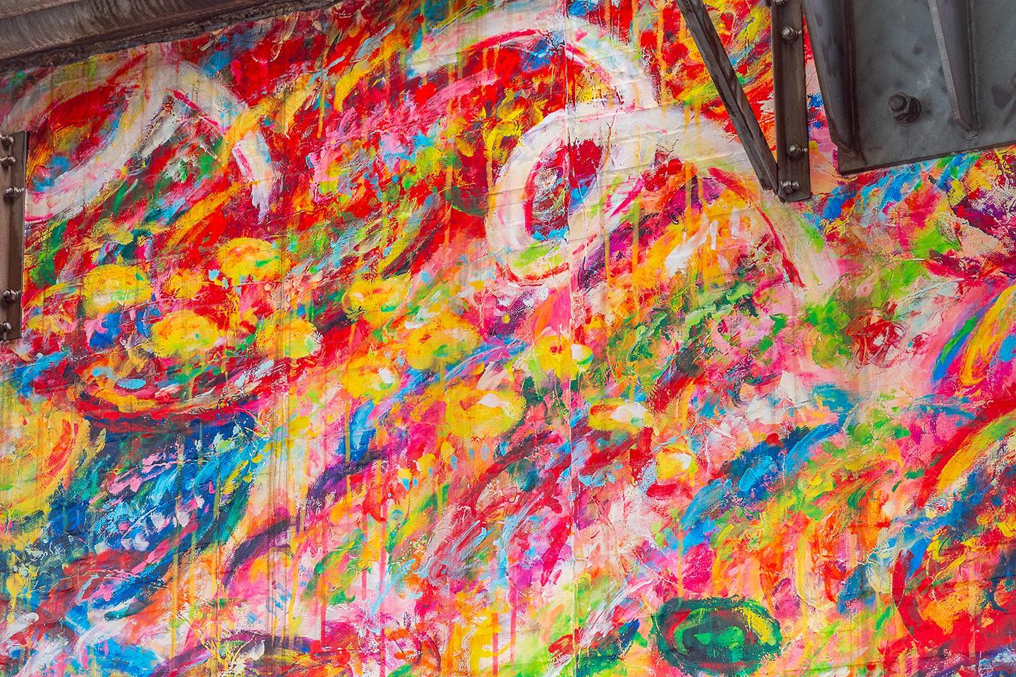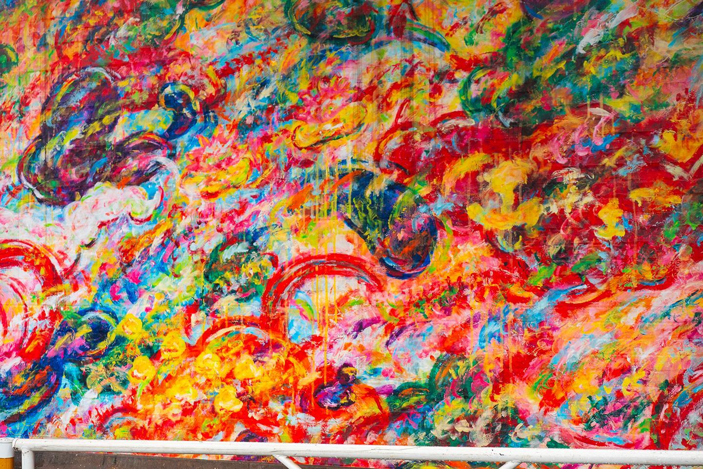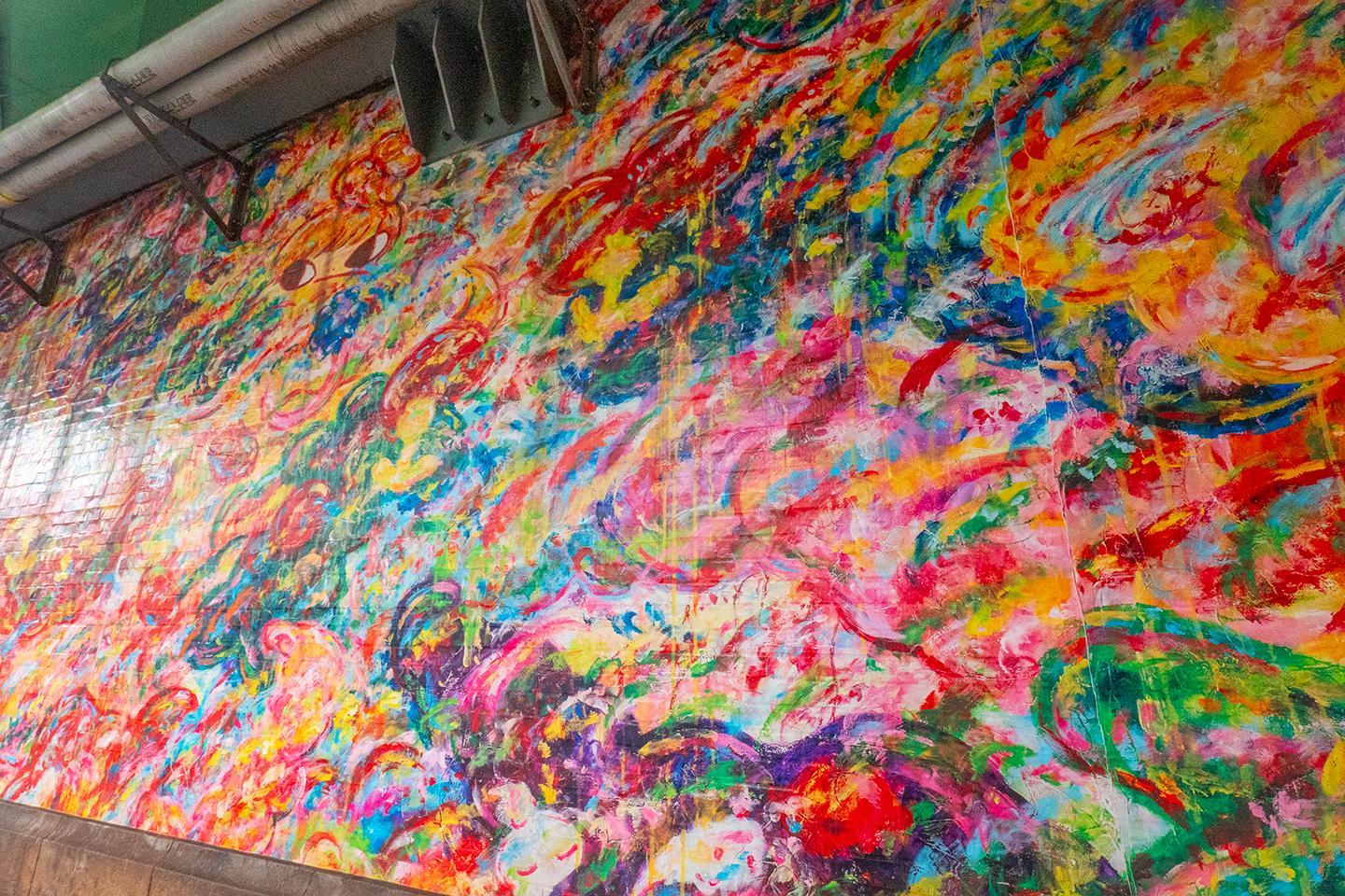 今回訪れたのは代々木駅前の高架下にあるロッカクアヤコの巨大壁画である。今年3月に公開され間もないこともあり、鮮やかな色彩と人気作家ロッカクアヤコの作品であることに通りがかる人が歓声を上げるほど。そんな一瞬で心を掴まれるような作品を立ち止まってじっくり見て本質に迫る。