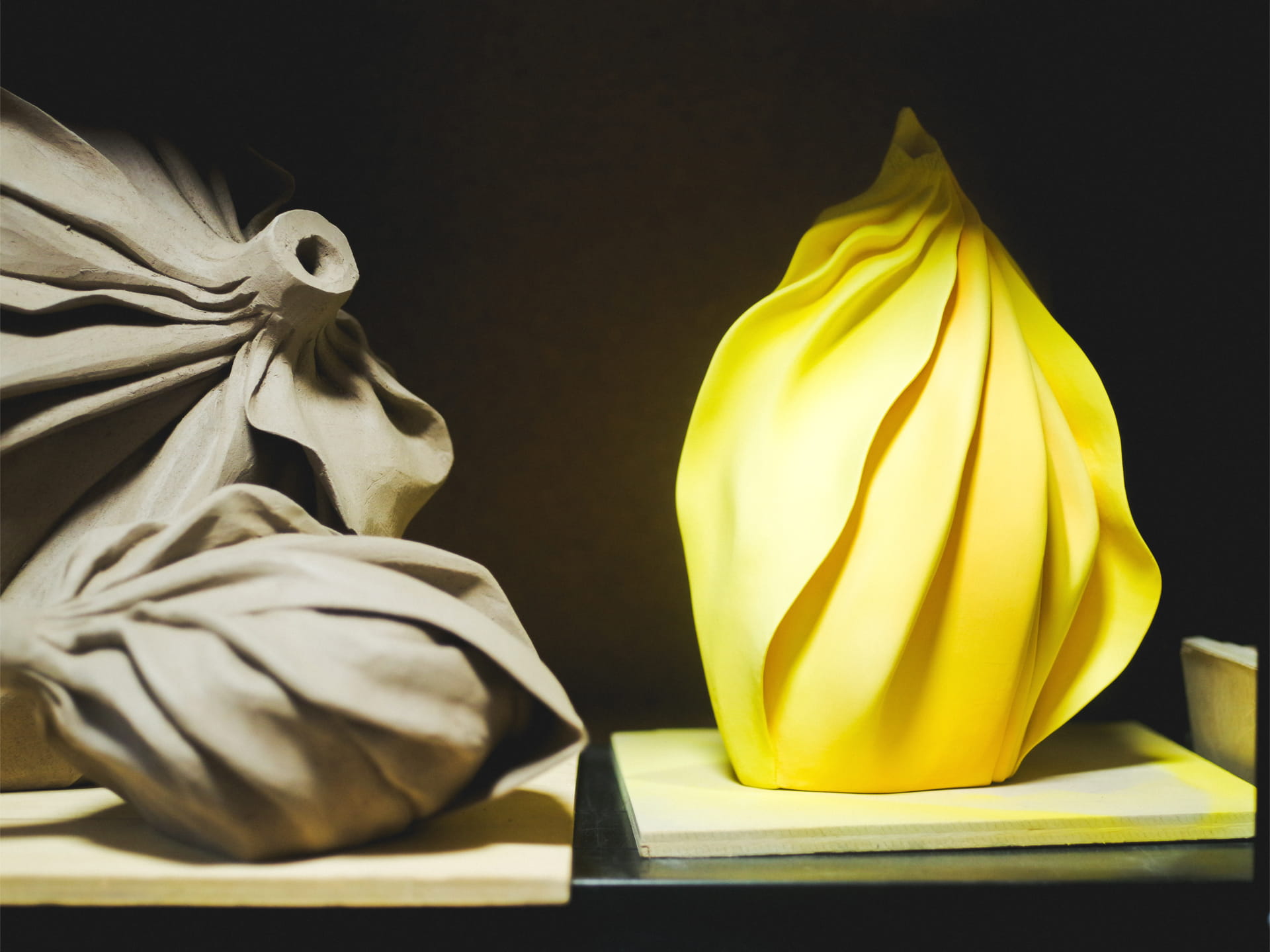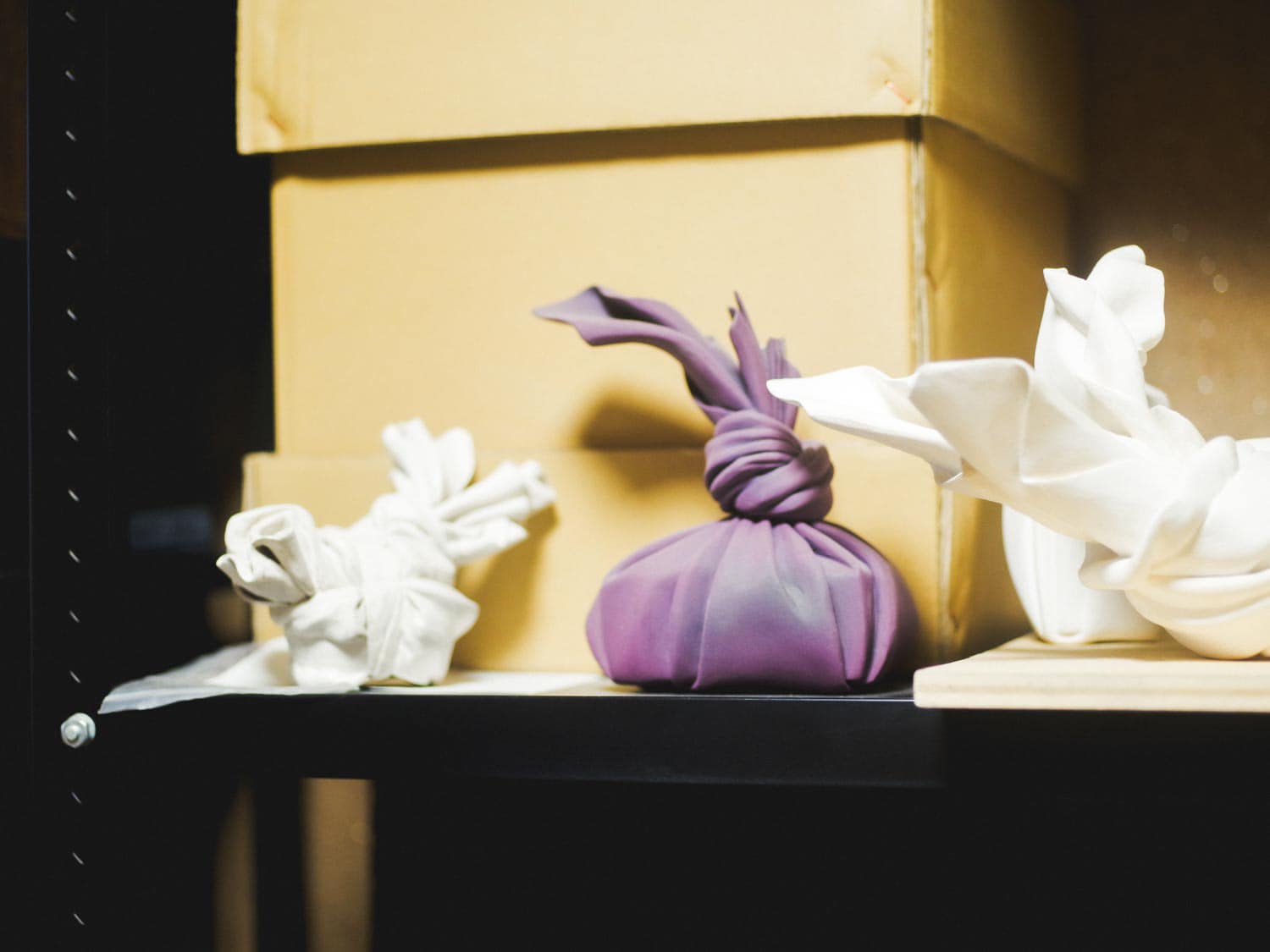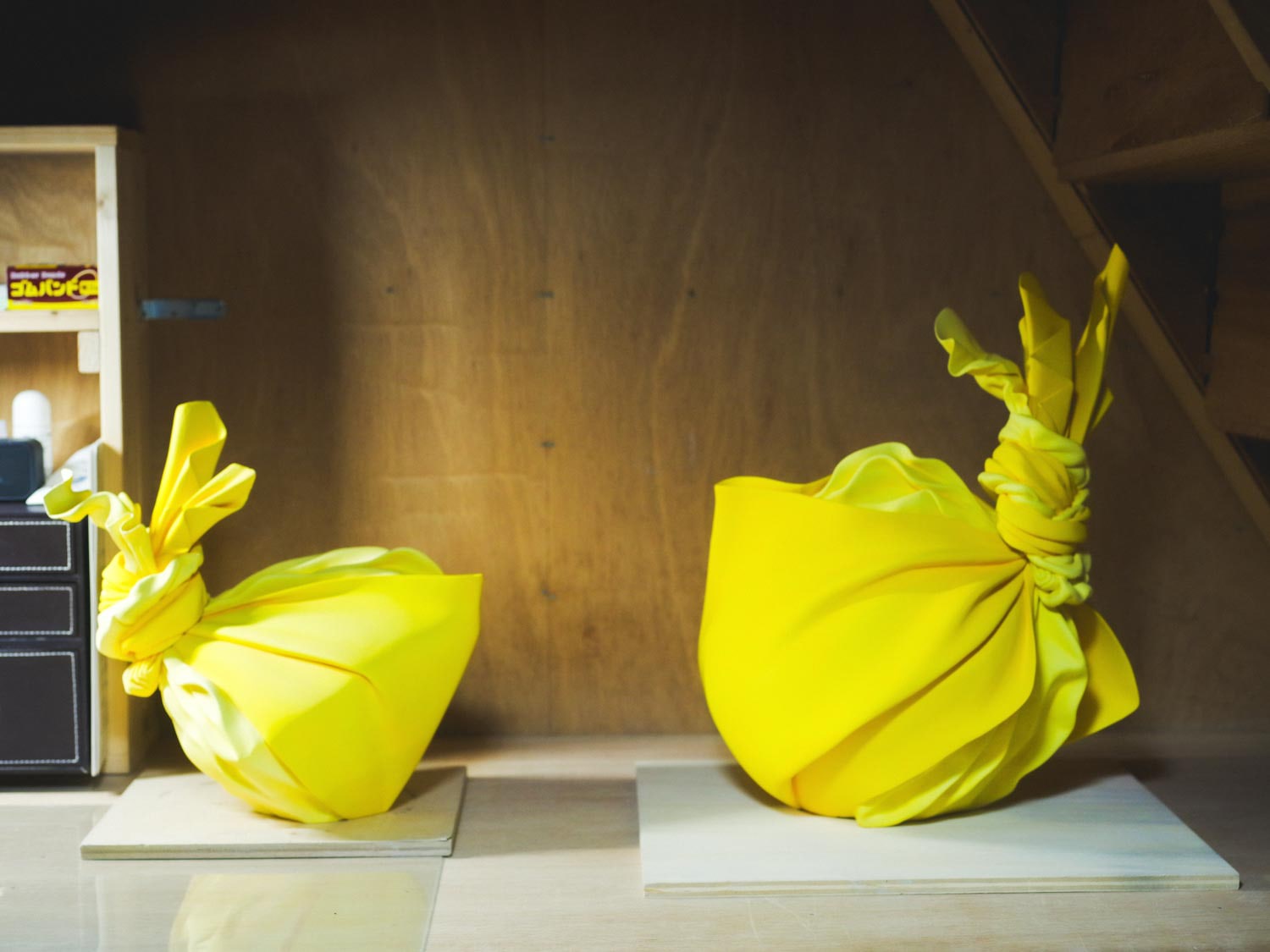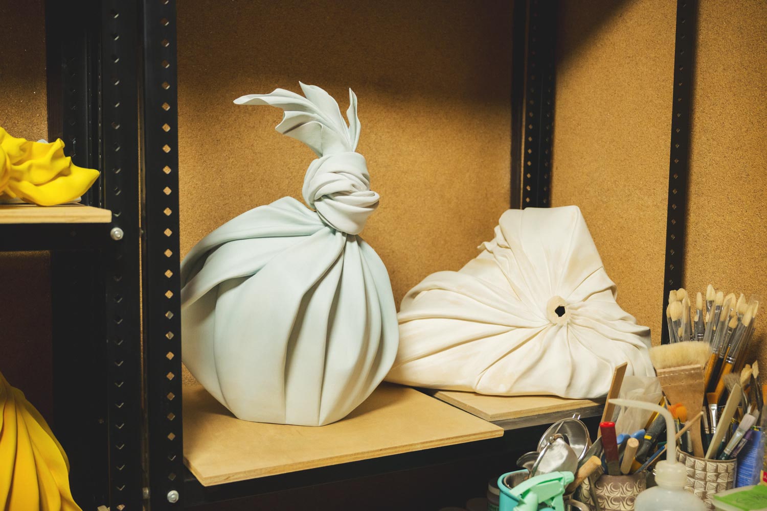 全てイメージで制作しています。以前は実際に布で何かを包んだモデルを作り、それを見ながら制作していました。しかしそれではコピーするだけで面白くなかったり、モデルの布に入った折れ目が邪魔で美しく作れないという問題がありました。モデル制作をやめて全てイメージで制作するようになったことで、そうした問題から解放され、より自由な造形ができるようになったと思います。