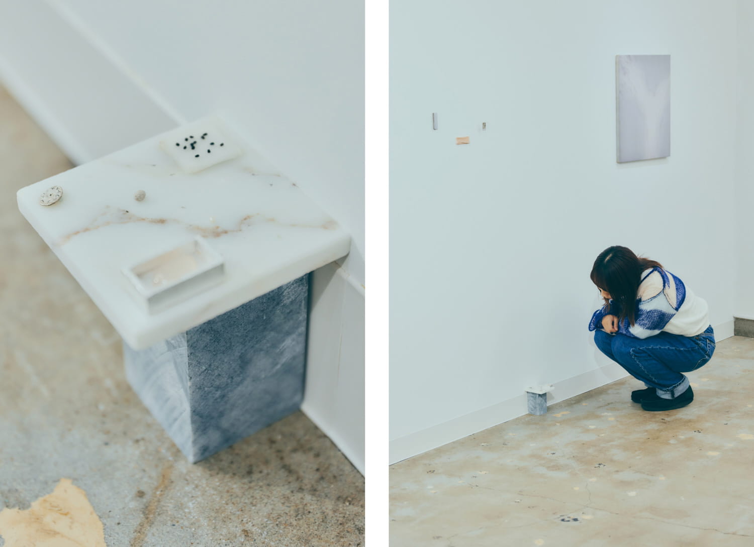 これね、とはじめに紹介してくれた作品は、大理石の上に、種子や石、シルバーが置かれたもの。これは小林さんが幼いころに読んでいた絵本のなかの「妖精を呼び込むための装置」を再現したものであるという。妙な現実感がある。種をついばむ妖精のようすが、見えるような感じすらある。みんなにはどんな妖精が浮かんでいるだろう。わたしはホワイトロリータに羽の生えたような感じのもの。ルマンドみたいなのも、いると思う。どうしてわたしの中の妖精はブルボンのお菓子に似ているのだろう。それぞれの妖精感をきいてまわりたい。それによって「妖精を呼び込むための装置」の姿は変わるだろう。