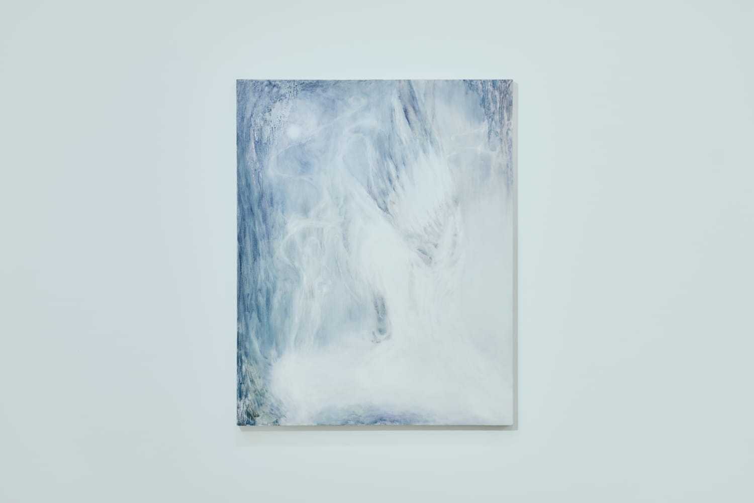それからね、と寺嶋さんがつぎに紹介してくれたのは、鳥がはばたく、そのほんの一瞬を描いた絵だった。その一瞬は、何カ月も反芻されたものなのだという。何度も思い出され、ほどかれ、また結び直された時間のことを思う。その絵は、「ステイニング技法」で描かれている。下地処理をしていない素地のキャンバスに、絵具を滲み込ませるやり方だそうだ。絵具は重力と水にまかせて流れ、筆のかたちはすぐに崩れてしまうので、思った通りにはとどまらないらしい。確かに、思い通りにならなさが、重要になるときはある、などと納得する。一枚の絵とは思えない奥行きを感じる。見る、ということ、見つめなおす、ということを、明くる日も明くる日も。そして描く、毎日、描く。日々見え方は変わるだろう。そうなれば、描き方も変わるだろう。小林さんは、そうすることで、自分のなかの、ほんとうのほんとうに近づこうとしているのではないだろうか。近づく日もあれば、離れる日もある、いやなものに見える日も、くるしく思う日も、きぼうのように感じる日もあるだろう。そのちがいに気づく目を持っていることは、わりとしんどいほうが大きいのではないかと思うのだ。さまざまなことに気づくようになると、いろいろ思うようになる、その思いが、ずっとからだの中でぐるぐるとするだろうから。しかし、それを受け入れ、使命のように描いている。そういった、ある種の神聖さを、小林さんの絵を見つめていると思い出すのだ。