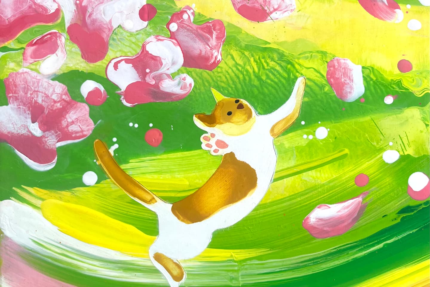 大きな紙に描かれた絵のへりには布や木材やまた別の紙が継ぎ足されている。その「えり」や「へり」によって、絵と壁の境目がより曖昧になり、いつもよりこころを開いて絵と向き合いたくなる。貼られた布のほつれ、足された板の木目。すべてのパーツが無秩序に、しかし確信をもってそこに置かれたのであろうという佇まいがあった。