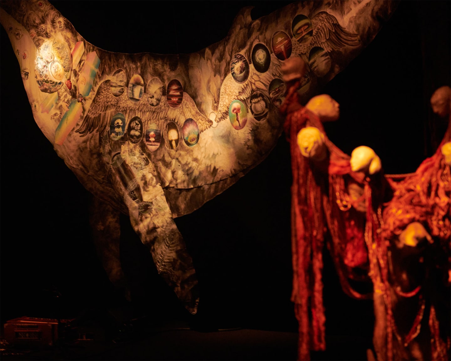 大小島:10月14日の最終日に張山しし踊り(遠野郷早池峰しし踊り張山保存会)を招いて、サウンドクリエイターのYosi Horikawa、Daisuke Tanabeとのセッションをする鎮魂のしし踊を開催しました。今回展示した《荘厳》の根本部分には、生前、私たちが関係していた亡くなった人たちの写真が置かれているんです。お客さんにとってではなく、まず私たちにとっての祈りの場なんです。具体的な祈りがないところに、普遍性は宿らないですからね。その上でも最終日に死者たちに向けて舞を踊ってもらうことが欠かせなかった。その場所を再び劇場に戻すための一つの儀礼として開催したんです。