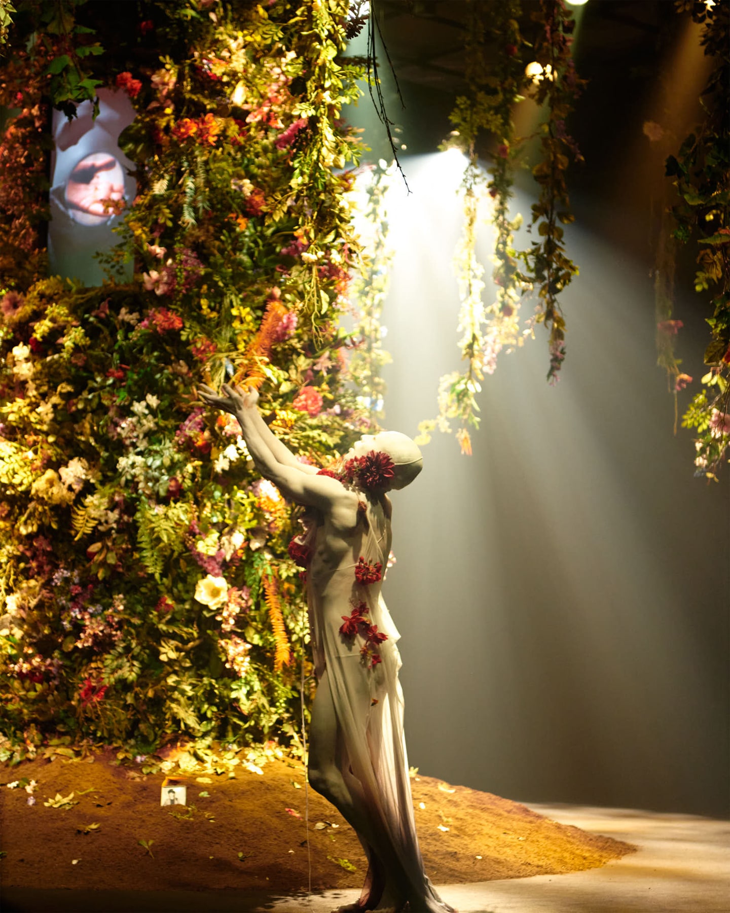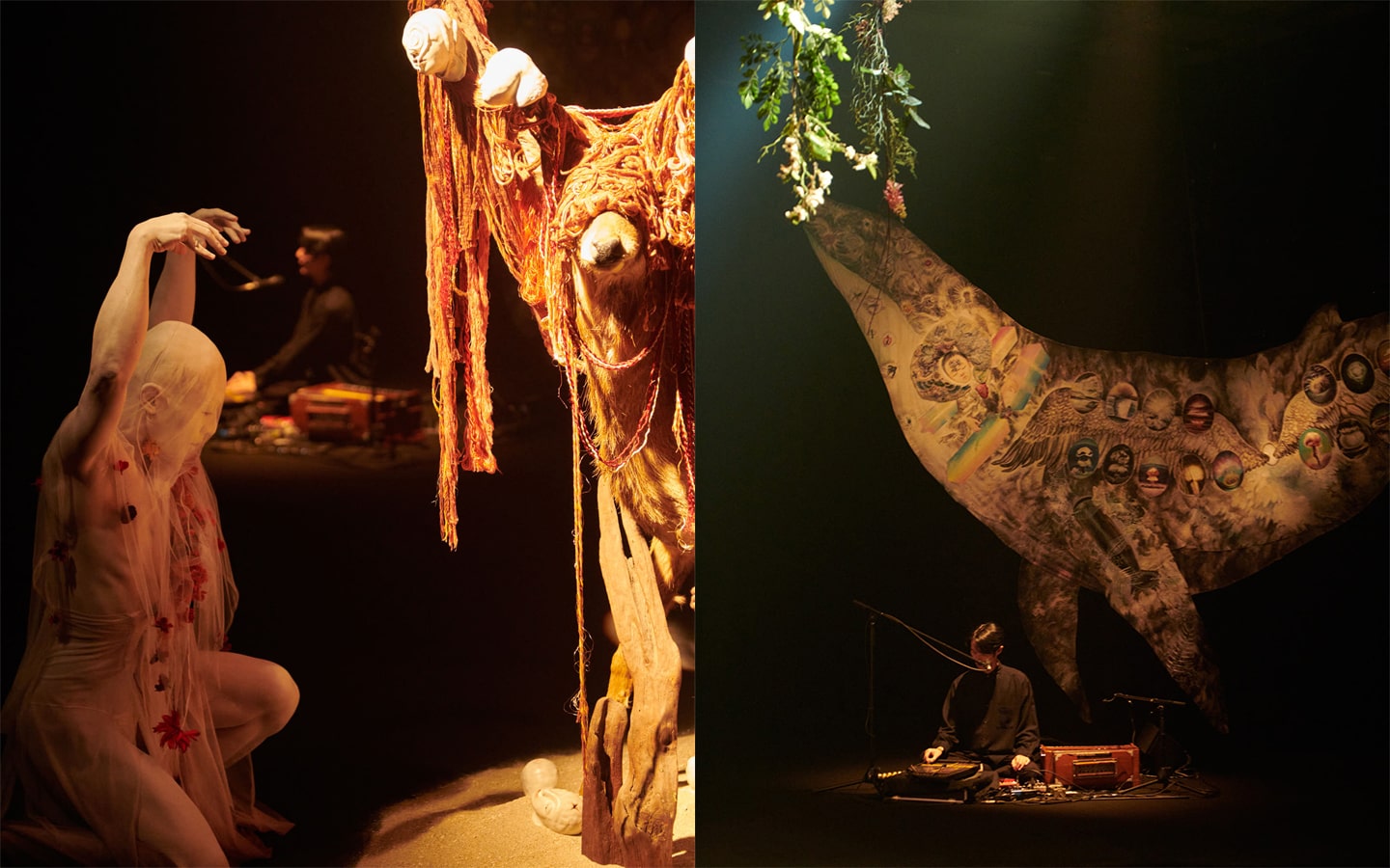 展示会場で舞踏家・松岡大さんがパフォーマンスし音楽家の佐藤公哉さんが演奏した「胞衣|Ena」の様子 Photo by Ura Masashi