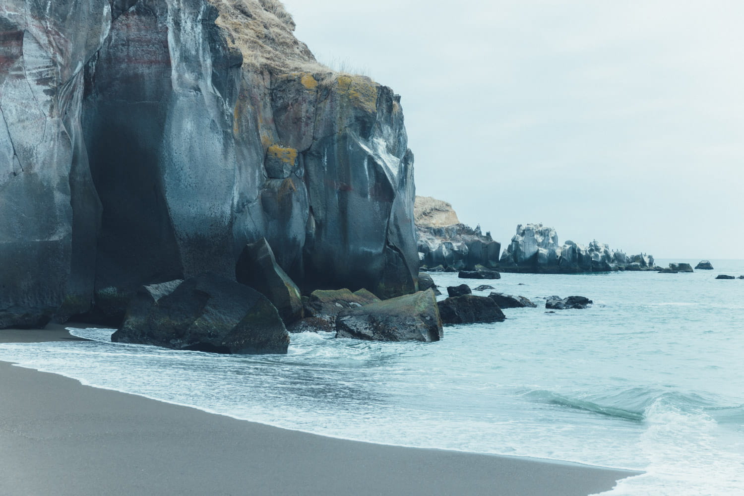 すごいですよね。この断崖は、何万年も前に俱多楽火山が噴火し、流れてきた溶岩や火山灰が作った地形だそうです。色や質感の違う層が積み重なっていて、それが剥き出しになっているのが面白い。こういう景色を見ていると、直線の亀裂は溶岩が冷えた時に入ったんだろうなとか、昔はここまで海水面があったんだろうなとか、とてつもない時間の積み重ねを感じます。このあたりはかつて「アヨロ」と呼ばれていた地域で、縄文時代の土器や遺跡も発掘されているんですよ。