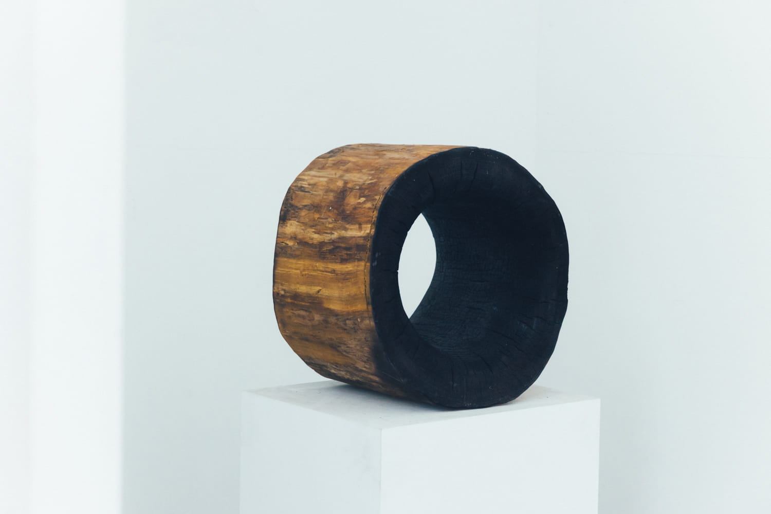 あの世とこの世の境界である「アフンルパㇽ」を知ったことから生まれた作品シリーズ〈WORMHOLE〉。直訳すると虫食い穴だが、時空を越えた場所とのつながりも意味する。木塊のコブや虫食い穴を活かし、木の表面や空洞の内部を焼くことで暗闇のイメージを与えている