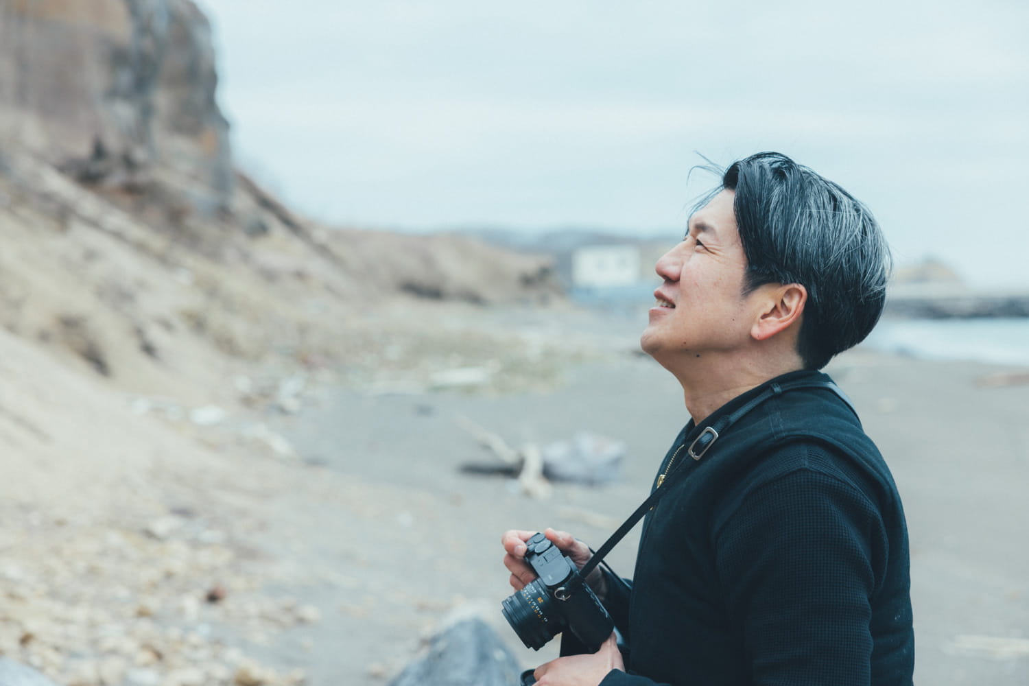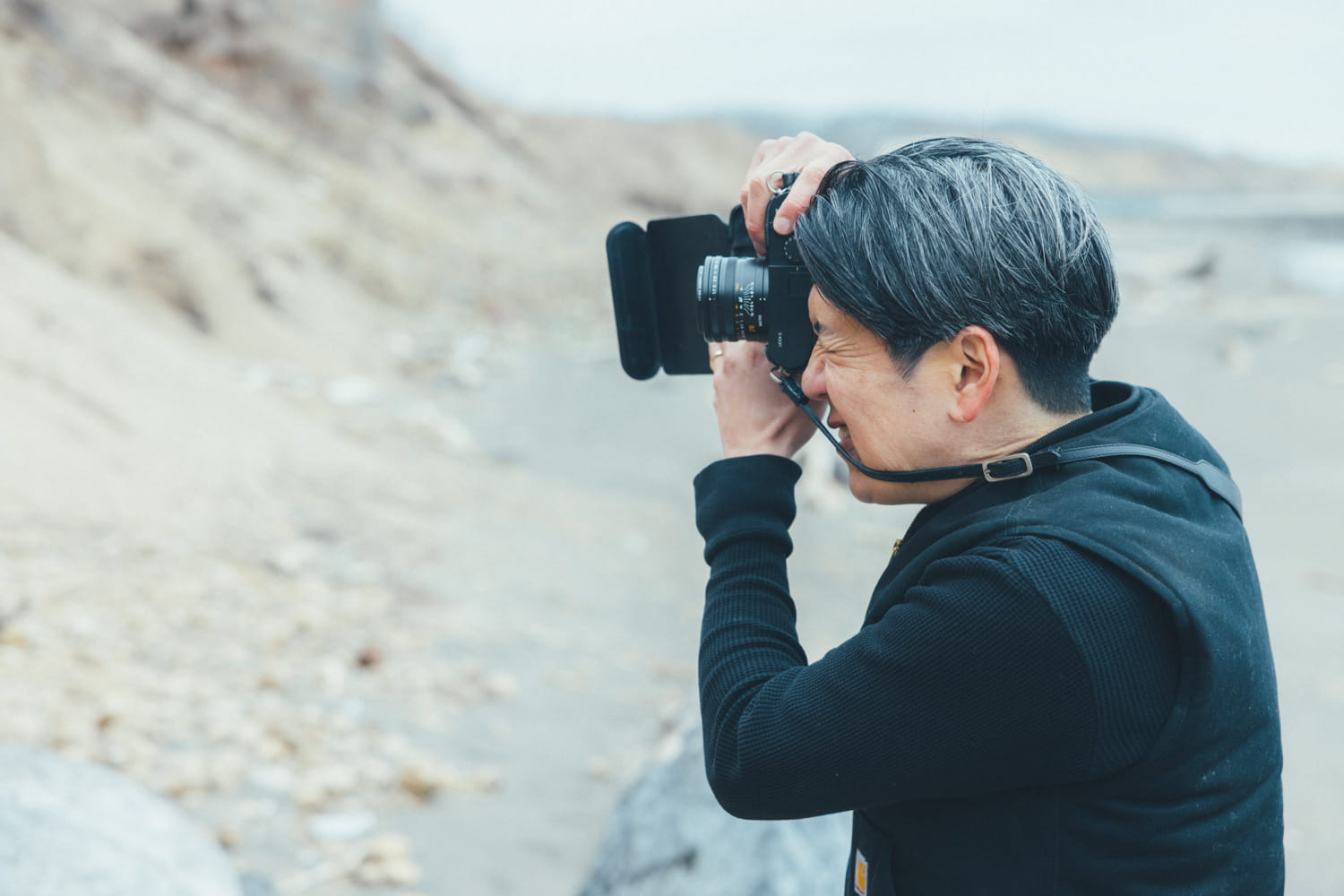 10年ほど愛用しているカメラで断崖の亀裂面や流木の写真を撮る国松さん