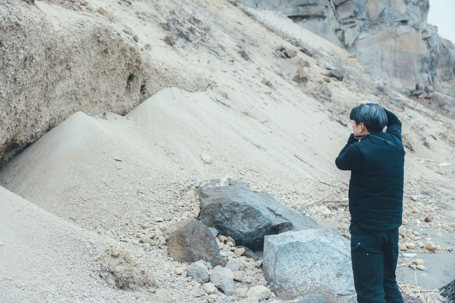 崖の上から落ちた岩塊が砂地に埋まり、新たな景色を作っている