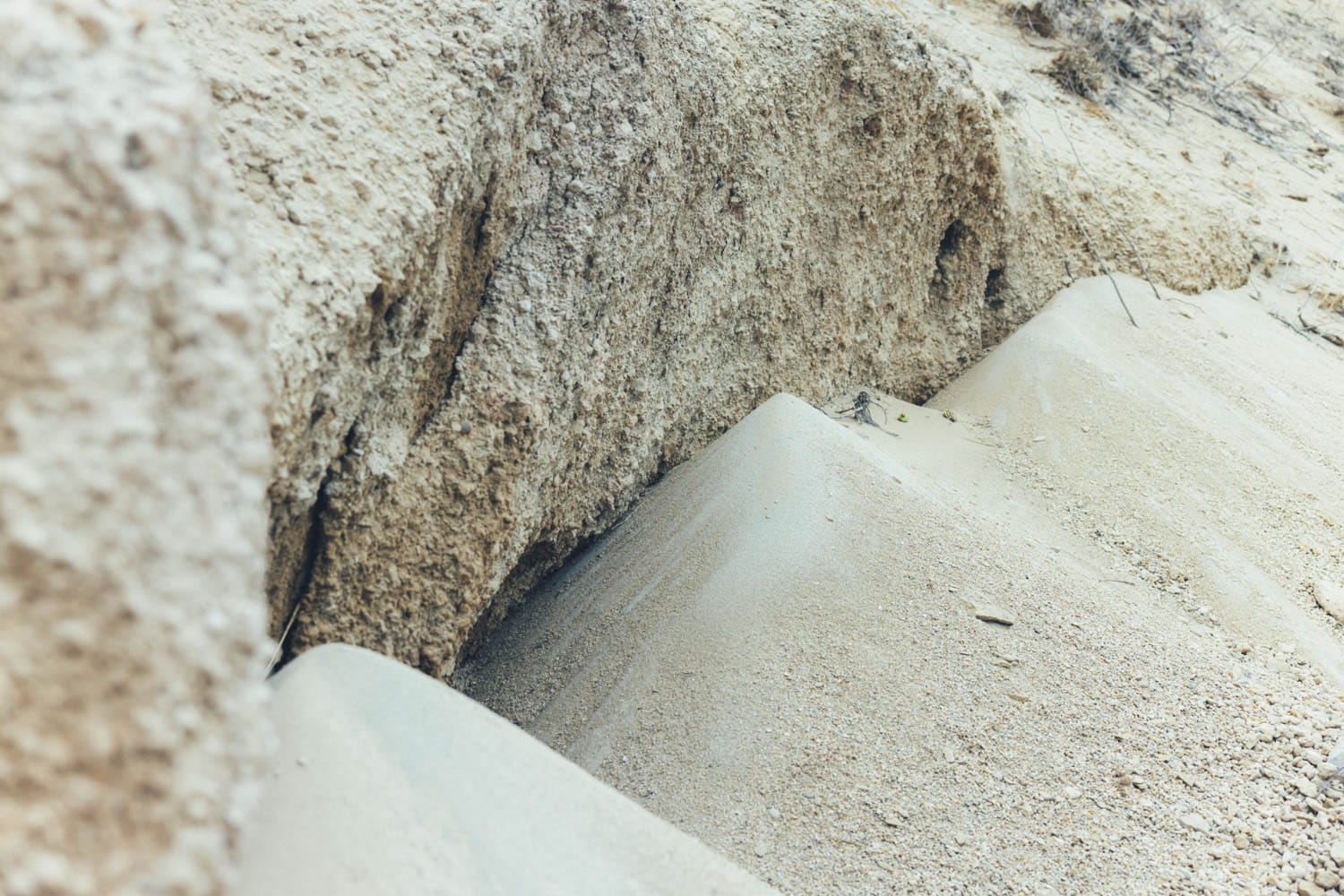 断崖が砕けて砂上に落ち、三角形に体積している。長い時間をかけてできた天然の砂時計のよう