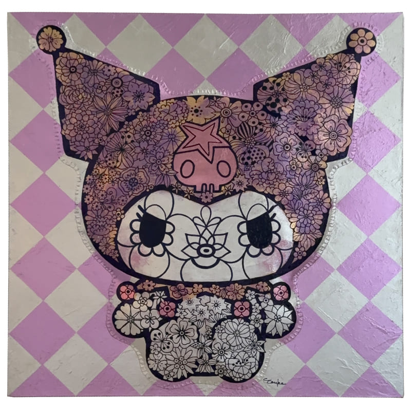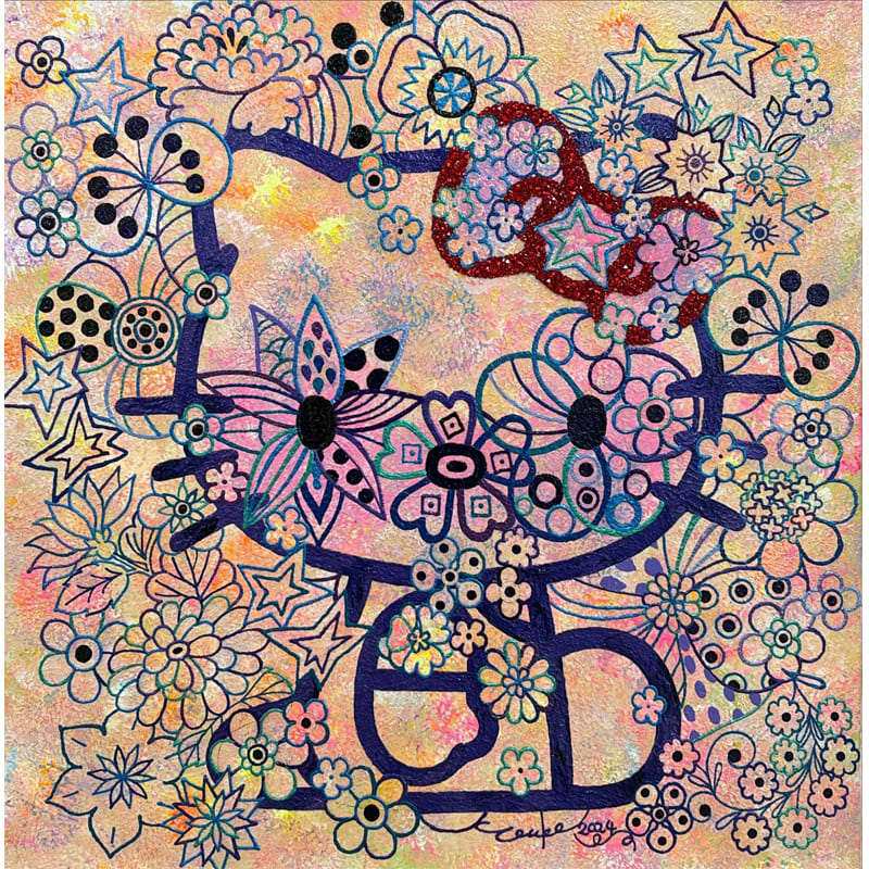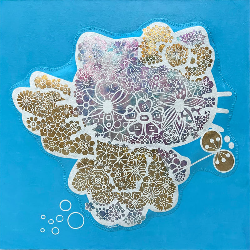 岡村透子「HAPPY ANGEL HELLO KITTY」 サイズ:65.5×65.5㎝ ミクストメディア、キャンバス