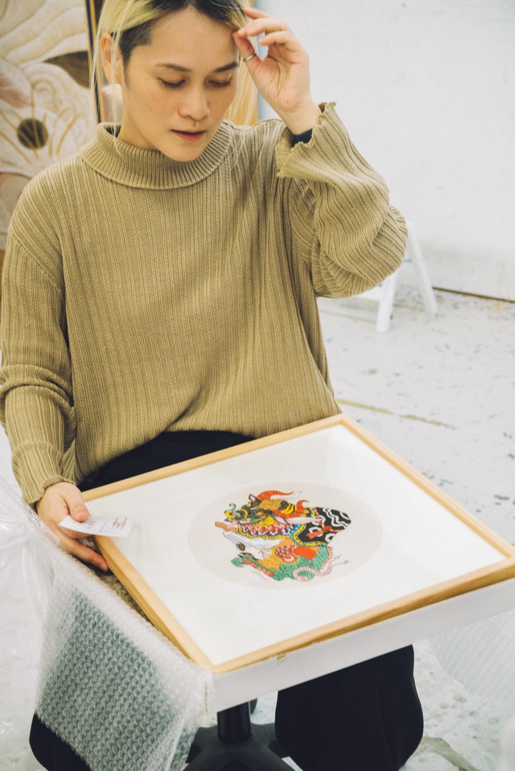 そんなfeebeeさんが生み出す白沢に、1つとして同じものが無いことが何よりも印象的でした。それぞれ異なる姿をしているのは、古来の神獣をただ伝統的に描くのではなく、現代のエッセンスをその都度に取り入れているから。と言っても、安易にスマホやデジタル数字といった現代的なアイコンを描き込まないところに、feebeeさんの矜持を感じます。