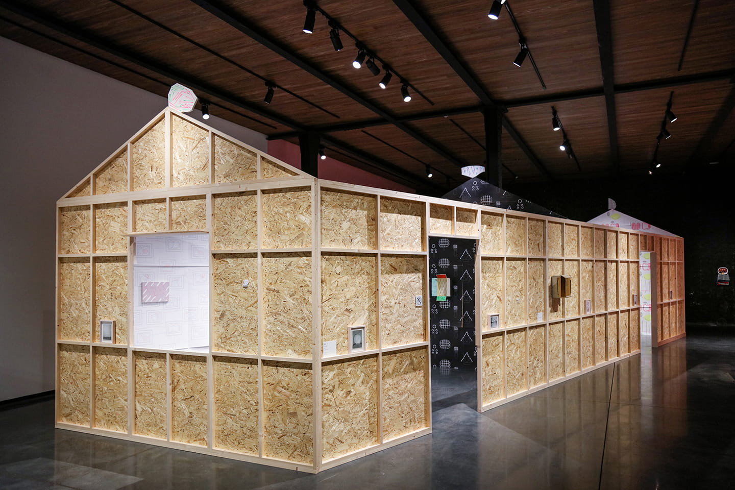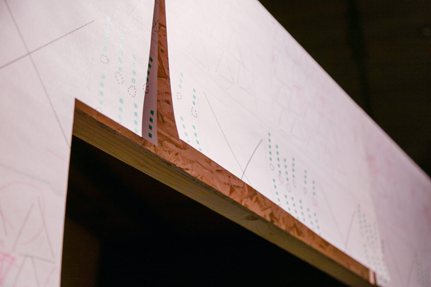 展示会場にはデザイナーの服部一成氏とコラボレーションした作品もある。パネルの裏側で構成された小屋の中に入ると、服部氏が制作したポスターの上に杉戸氏の作品が展示されている。外側にもさまざまな仕掛けが施されている