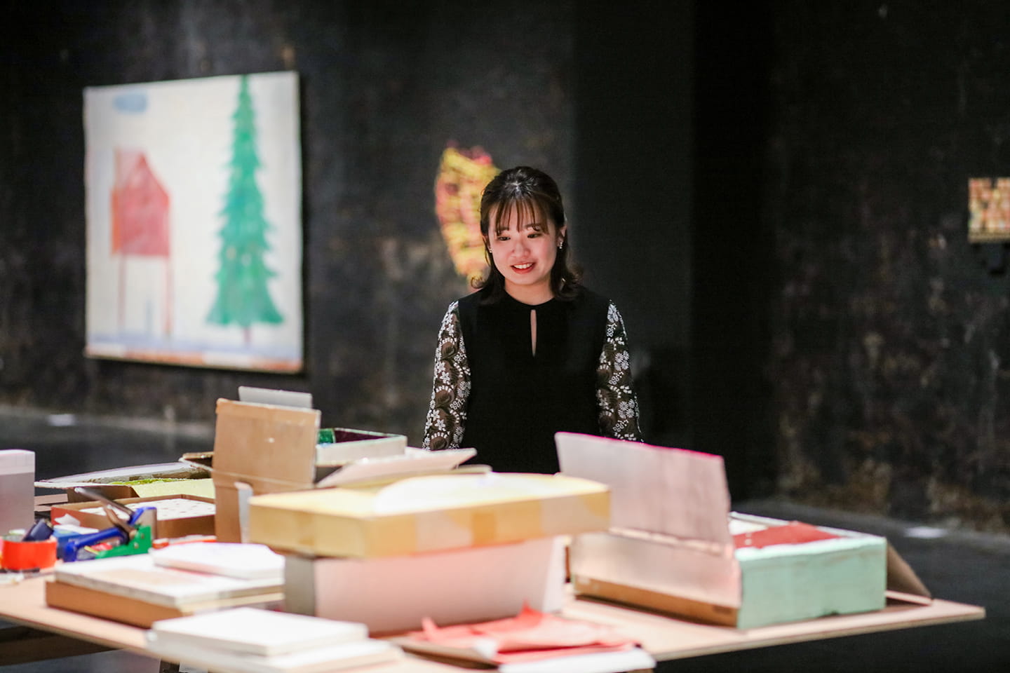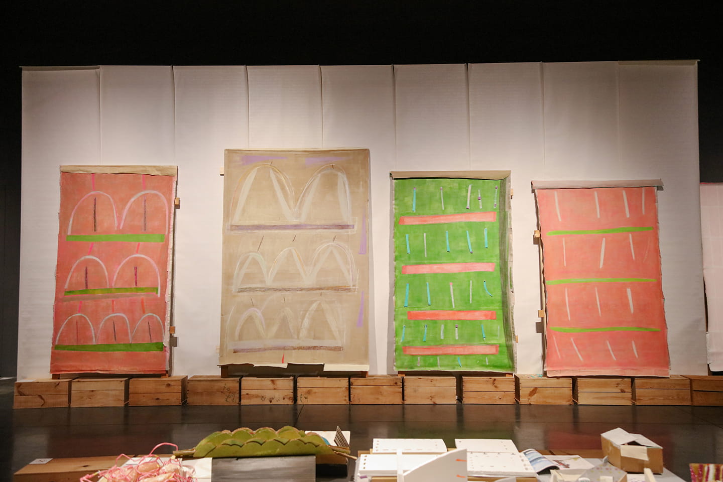 3点の作品が重なるように立てかけられて展示され、その土台を支えているのはりんご箱だ