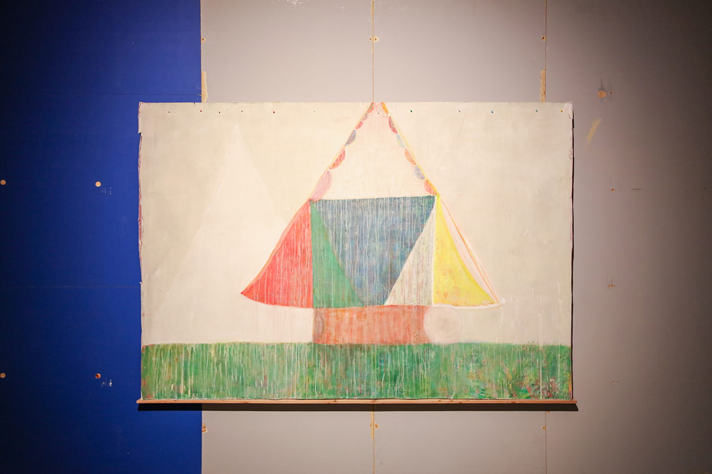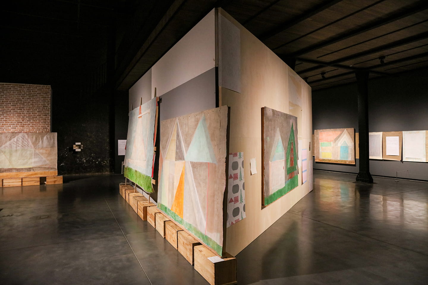 杉戸氏の作品は、どれもこの壁との相性が抜群であった。木のようなもの。家のようなもの、窓のようなもの。一見シンプルで朗らかでかわいらしいように見える絵だけれど、近づいてみると前の絵がうっすらと透けていて、何度も上描きされているのがわかる。単に「あたたかい」「かわいい」「遊び心」と片付けることは到底できない圧倒的な存在感と説得力があって、わたしは「たはー」と小さく声を漏らしてしばらくそれを眺めた。1990年代の作品に2020年代になってさらに加筆を加えた作品群が展示の中には多くあるのだけれど、そのどれもに立ち止まってじっくりと眺めたくなる。レモンのようなもの。雲のようなもの。かつて描かれたものが消され、けれど透けて残っている。かっこいい。ひとつの絵の中に時間の薄い膜がいくつも重なり、のんびりとしているのに強くもある。糊付けを開いて展開図のようになった封筒や、パッキングされていた梱包材が添えられてはじめて完成される作品。けれどその「完成」も、「いまのところの完成」なだけで、これからのことはわからない。その刹那を歴史のある建物の中に構築している、そのかっこよさに痺れる。
