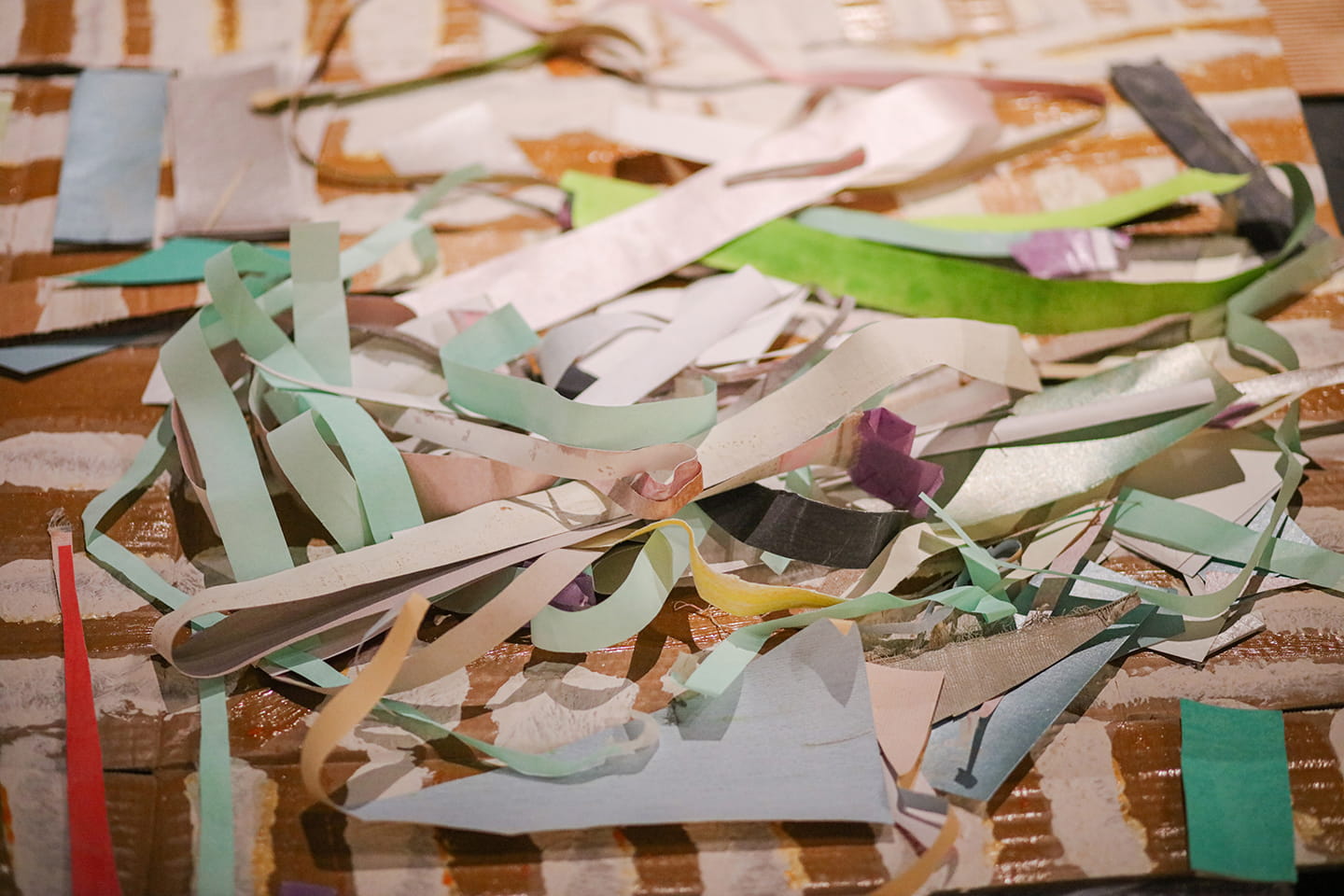 《color tree 2》の飾られている壁もその必然の一つではないだろうか。青が差し色のようになったこの壁は、前の展示の壁をそのまま使ったものだという。現地で展示を作る際に、当初一色に塗りなおすか、壁紙を貼る予定だったものを杉戸氏が気に入ってこのままにしようということになったらしい。青い面に残る何かを剥がしたような跡や、途中からグレーに切り替わる壁を気に入った、というのは、作品を見ているととても頷けるものがある。ほかにも制作中、梱包材や立ち寄った飲食店などにインスピレーションを受け、その場で決まったことも多いらしい。即興の妙も存分に楽しめる展示だと思う。