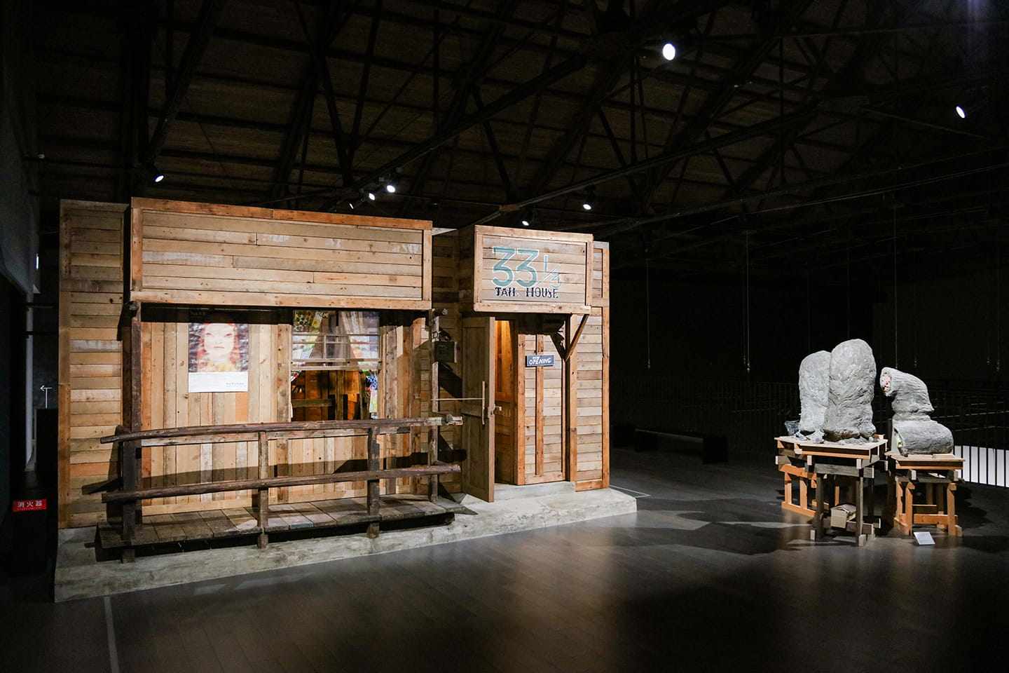 コレクション展には、奈良美智が学生時代にアルバイトしていたというロック喫茶「JAIL HOUSE 33 1/3」を再現した資料も展示されている。その右手には、杉戸洋とのユニット・シャギャーンによるリーゼントの彫刻作品が並ぶ。杉戸が高校生のとき通っていた美術予備校で講師を務めていた奈良とは、その後も現在に至るまで親交が続いている